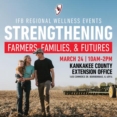 Illinois Farm Bureau members are encouraged to sign up today for the upcoming Strengthening Farmers, Families, & Futures event on Tuesday, March 24, from 10 a.m. -2 p.m. at the Kankakee County Extension Office in Bourbonnais, IL. Members will have the opportunity to hear speakers on the following topics: Prepare for the Unthinkable; Stop the Bleed; What Family Needs at the Time You Pass; Testimonial, Disability Weights & Resources; Steady Through the Season; Simple PT Exercises; and Eating Right.